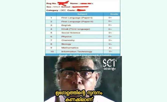 എസ്എസ്എല്സി പരീക്ഷയിലെ പത്ത് വിഷയങ്ങളില് ഒന്പതിലും ഡി പ്ലസ്, എന്നാല് കണക്കില് മാത്രം എ പ്ലസ്. ഈ മിടുക്കന് അല്ലെങ്കില് മിടുക്കി ആരാണെന്ന് സോഷ്യല് മീഡിയയ്ക്ക് അറിയില്ല. പക്ഷെ ഈ റിസല്ട്ടാണ് വൈറലായത്. പലരും ഇതില് ട്രോളുണ്ടാക്കി. സാക്ഷാല് ശ്രീനിവാസ രാമാനുജന്റെ കുടുംബമാണ് റിസല്ട്ടിന്റെ ഉടമ എന്നാണ് ചിലരുടെ കണ്ടെത്തല്.