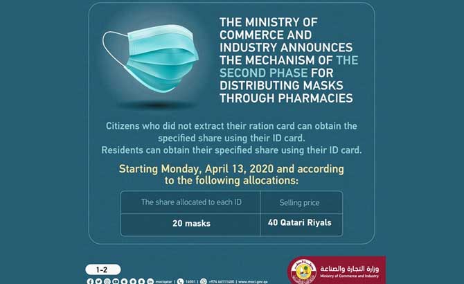 ഖത്തരി ഐഡിയുള്ള ഓരോരുത്തര്ക്കും നാല്പ്പത് ഖത്തരി റിയാലിന് ഇരുപത് മാസ്കുകള് വീതമാണ് നല്കുക. നേരത്തെ കോവിഡ് പ്രതിരോധ വസ്തുക്കളുടെ വിതരണത്തിന്റെ ഒന്നാം ഘട്ടത്തില് അല് മീര സൂപ്പര്മാര്ക്കറ്റുകളുടെ വിവിധ ശാഖകളിലൂടെ ഖത്തരി പൗരന്മാര്ക്ക് മാത്രമാണ് മാസ്കുകളും സാനിറ്റൈസറുകളും വിതരണം ചെയ്തിരുന്നത്.